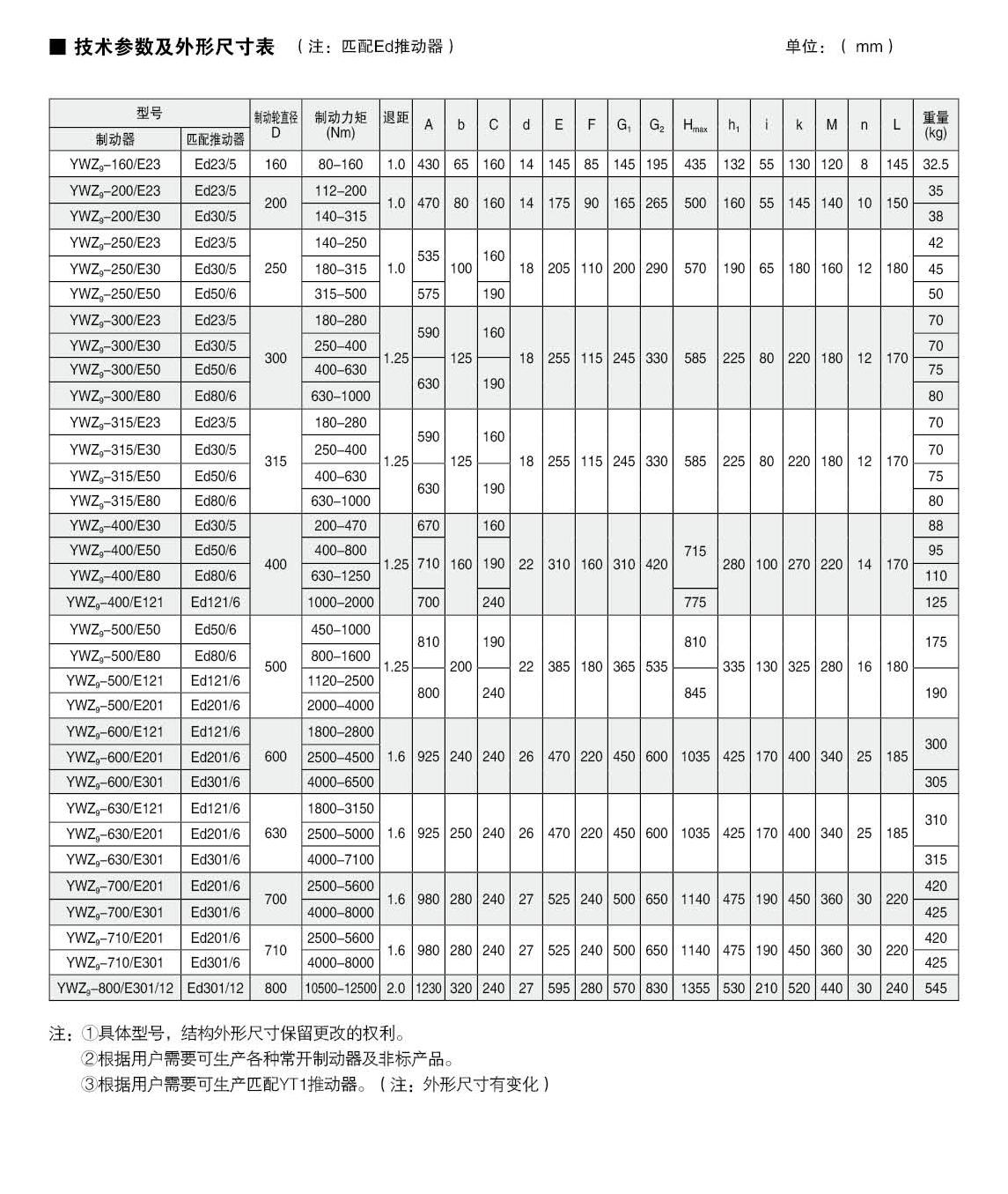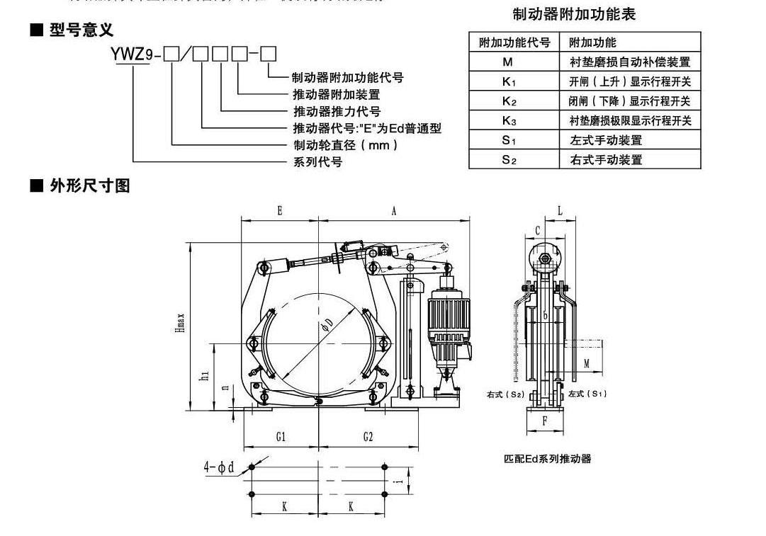 應(yīng)用:YWZ5  YWZ9系列電力液壓鼓式制動(dòng)器,廣泛應(yīng)用于有防爆要求的各種起重運(yùn)輸、皮帶運(yùn)輸、港口裝卸、冶金及建筑機(jī)械中各種機(jī)構(gòu)的減速和停車(維持)制動(dòng)。符合標(biāo)準(zhǔn):YWZ5系列電力液壓鼓式制動(dòng)器的連接尺寸和制動(dòng)力矩參數(shù)符合GB6333-86標(biāo)準(zhǔn),技術(shù)要求符合JB / T6406-2006標(biāo)準(zhǔn),配套符合DIN15430標(biāo)準(zhǔn)的Ed系列推動(dòng)器。主要特點(diǎn):▲ 聯(lián)鎖式退距均等裝置和瓦塊自動(dòng)隨位裝置,可始終保持兩側(cè)瓦塊退距均等且無需調(diào)整,完全避免因退距不均使一側(cè)制動(dòng)襯墊浮貼制